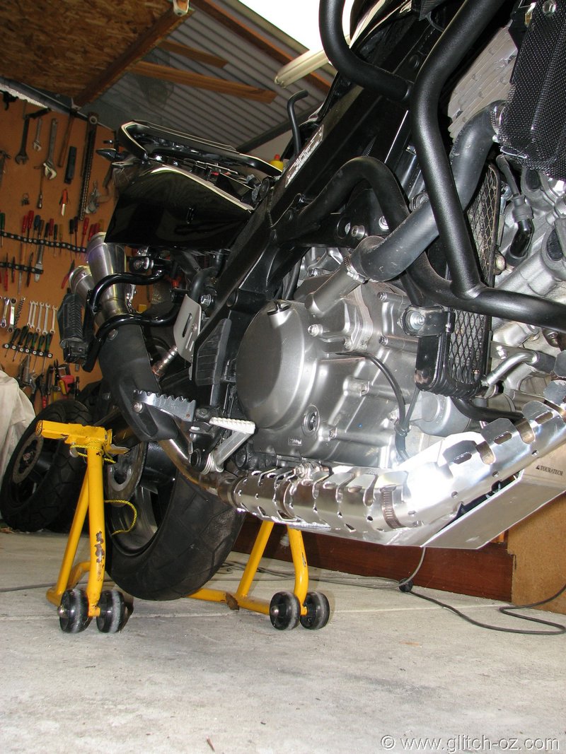 Upon request, here’s a pic showing the front header pipe relocated from running under the sump to running along the right-hand bottom edge of the engine. That allowed the bashplate mounting brackets to be re-fabbed to tuck the bashplate (Touratech) under the guts with only 4mm clearance.