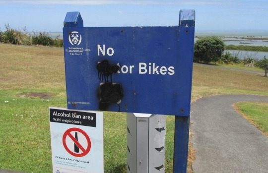A council sign warning against riding motorbikes in the area has been vandalised itself. Motorbike hoons cause chaos on public walkways along south Auckland foreshore Shiri Te Whatu got a...