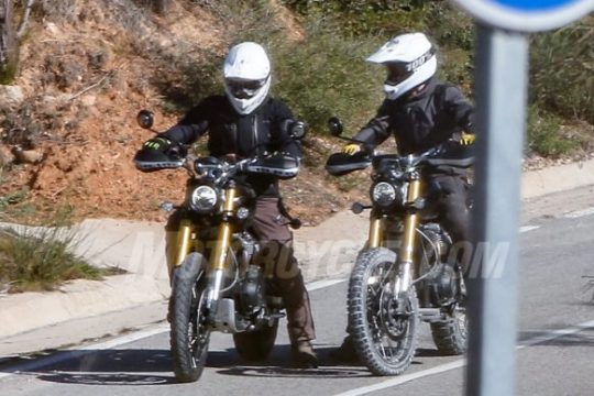 Spy photo’s have emerged online of riders testing was appears to be a 1200cc scrambler with tall enough suspension to give true off road performance. 21 inch front wheel, Ohlins...