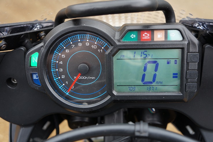 Even the slim seat is comfortable for over 100 miles, in part because the foot-peg position is so relaxed. My longest day in the saddle has been 260 miles and with the odd photo or tea stop I haven’t even noticed the seat.The clocks which nestle behind the screen feature a ‘traditional’ rev counter, large digital speed readout, the usual warning lights, time clock, single trip meter and a fuel gauge. Rather bizarrely, there’s another 6-bar gauge which seems to measure battery performance, and yet no charge light. In excessive rain (and there was plenty of that over Halloween) there must be water ingress somewhere as the indicator warning lights flash continuously at various intensities. This doesn’t affect the indicator use at all, but is a little disconcerting.